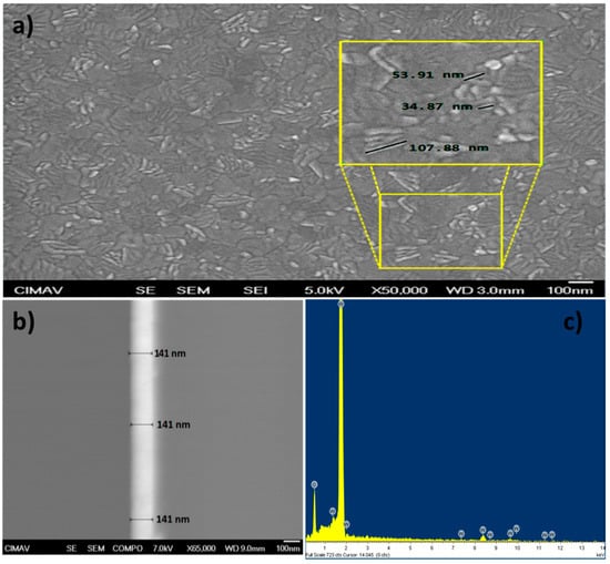 SEM image of β-WO3 thin film surface after the two-step annealing treatment. (a) Micrographs of the β-WO3 thin film with a zoomed area that shows the grain size; (b) β-WO3 thin film transversal area obtained with backscattered electrons; (c) β-WO3 thin film EDS spectrum.