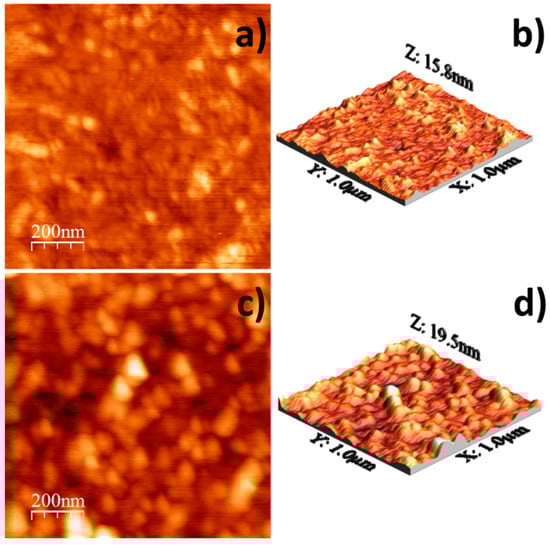 Figure 4a–d show 2D and 3D AFM images (scanning area of 1 μm × 1 μm) of the as-deposited and of the two-step annealed (T1 + T2) samples. Figure 4a,b for the as-deposited film show a smooth film surface, some grains with grain boundaries that are not well defined and grain sizes in the range 40–60 nm. The root-mean-square (RMS) of the surface roughness is 1.4342 nm, with a highest roughness height of 15.8 nm.