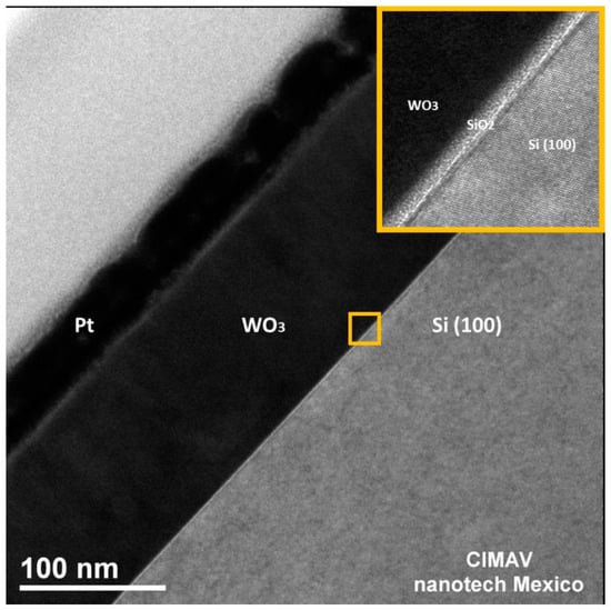 Figure 5 shows a HRTEM image of the β-WO3 film cross section, where various layers are indicated. The lower right bright corner is the (100) silicon substrate. The magnified insert with the Si/WO3 interphase shows a 3-nm-thick amorphous layer of SiO2, which is originated by the oxidation of the Si surface in contact with air []. The next layer, above the amorphous SiO2 layer, corresponds to the WO3 thin film. Finally, the last layers are platinum/carbon protective layers deposited to protect the specimen from FIB damage.