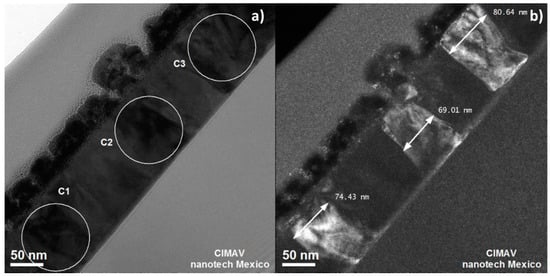 Figure 6 shows cross-section bright-field and dark-field images. In the images, three crystals, labeled as C1, C2 and C3, can be identified with roughly the same orientation. In the dark-field image, the shape and width of each crystals are particularly evident.