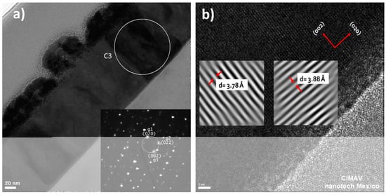Figure 7b is a HRTEM image showing the (002) lattice planes parallel to the silicon substrate and the (020) lattice planes perpendicular to the substrate. The interplanar distances for these two sets of planes are better shown in the inserts after digital processing using the Digital Micrograph software. The calculated interplanar distances correspond with the reported in the crystal data sheet 01-089-4480. These results coincide with the results from X-ray diffraction, where the preferential reflection correspond to the (002) plane. The same results can be obtained using crystals C1 and C2, as all of them have the same crystallographic orientation.