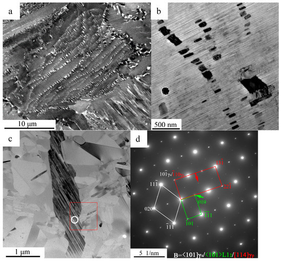 (a) SEM—BSE and (b,c) TEM images of the microstructures annealed at 850 °C for 5 h; (d) SADPs of the white circle in (c) with B = <101]γs. The red rectangle in (d) represent the calibration of the γp phase and the green rectangle represent the calibration of the L12 phase.