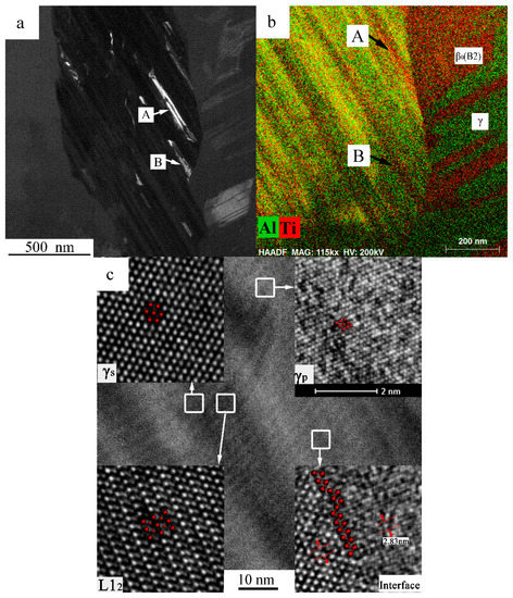 (a) Dark field and (b) scanning transmission electron microscope (STEM) area scan (step = 0.35 nm) images of the red square region in Figure 2c; (c) HRTEM images of the γs, L12 and γp phases with B = <101]γs. The red dots in (c) represent the HRTEM atomic configurations of the γs, L12 and γp phases.