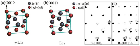 The existence of the metastable L12-Ti3Al phase can be determined through the superlattice analysis and composition distribution. As the HRTEM image of the BD≤10]γ is presented in Figure 4c, the BD of the γ phase should be one of the [101], [10], [011] and [01] crystal directions but not the [110] or [10] according to crystallography analysis. Therefore, the superlattice patterns marked by the green arrow (Figure 3d) should be the diffraction spots of the L12 structural phases. In the ordered L12 phase, the Wykoff positions 1a and 3c are occupied by Al and Ti atoms, differentiating the Wykoff positions in the γ phase, as presented in Figure 5a,b. The schematic SADPs of the L12 and γ phases with B = [10] are presented in Figure 5c,d corresponding to the aforementioned analysis.