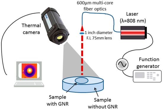 The experimental setup was design to image the temperature distribution over the sample under laser irradiation by a radiometric thermal imaging camera (FLIR Systems Inc., model A325, Wilsonville, OR, USA). As shown in Figure 1, the laser illuminates the sample from above, in perpendicular to the sample surface. A near infra-red (NIR) laser at wavelength of 808 nm and power density of 1.6 W/cm2 and less was used. This NIR laser is in wavelength near the longitudinal SPR of the GNRs we used. The NIR region of the spectrum provides the maximal penetration depth of light into the biological tissue. The penetration depth of red and NIR light, in this region between 650 and 900 nm, is up to 100 mm, depending on the exact type of tissue [32]. In comparison, the penetration depth of green Nd:YAG laser (532 nm wavelength) is less than 0.5 mm [32]. The laser illumination was modulated using a function generator (AFG3022B by Tektronix, Beaverton, OR, USA) to create a square wave, where the rise time and the fall time are short compared to the on time of a period of the laser pulses, with different frequencies and duty-cycles.