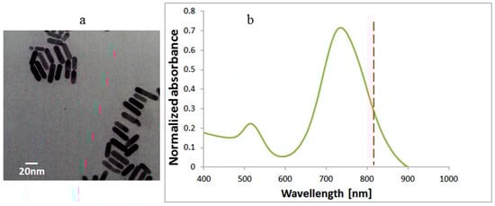The gold nanorods used had a 37 nm length and a 10 nm diameter, purchased from Nanopartz Inc. (Loveland, CO, USA). In Figure 2a, one can see the TEM (Transmission Electron Microscope) (CM 100, Philips, Eindhoven, The Netherlands) image of the GNRs and the absorbance spectrum (ultraviolet-visible spectrometer, Shimadzu, UV1650 PC, Tokyo, Japan). The peak at 530 nm arises from the electron’s resonance at the small size (10 nm) of the GNRs and the peak at 770 nm arises from the long size (37 nm) resonance.