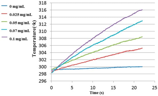 As shown in Figure 3, the temperature of the sample without GNRs remained almost unchanged, while the temperatures of the samples with GNRs were elevated with the heating time. The relatively small temperature change of the reference phantom was due to the India Ink that was added to the phantoms as an absorption component to mimic the natural absorption of healthy tissue. Furthermore, it demonstrated that there is a correlation between the GNR concentration and the temperature elevation. For the highest GNR concentration (0.1 mg/mL), after 20 s, a temperature elevation of about 16 °C was observed, while for the lowest concentration (0.025 mg/mL), the temperature change after 20 s was about 6 °C. In Figure 4 the linear temperature changes as a function of the GNR concentration are shown. One can see a linear relation between the GNR concentration and the temperature elevation.