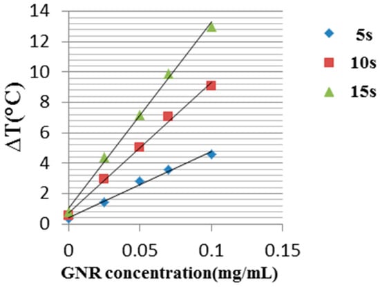 Figure 4. Temperature change as a function of GNRs concentration for three different illuminations times: 5, 10 and 15 s.