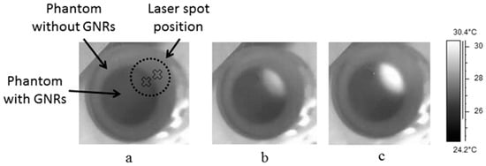 Figure 5. Thermal images of the sample: (a) without irradiation; (b,c): after 5 and 10 s of continuous-wave (CW) illumination, respectively. It can be seen that the heated zone increased during the illumination time.