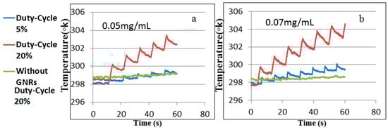 In the experiment, the temperature change was measured on the two sides of the border, as shown on Figure 5a for two different GNR concentrations of 0.05 and 0.07 mg/mL. Two different duty-cycles were used, 5% and 20%, in order to demonstrate the differences in the heating and cooling processes, as shown in Figure 6.