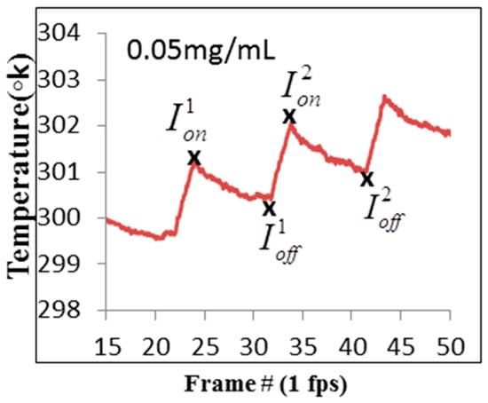 Figure 7. Temperature change as a function of frame number for GNR concentrations of 0.05 mg/mL and 20% duty-cycle laser illumination. The specific frames that were used in the proposed method are marked with a black x.