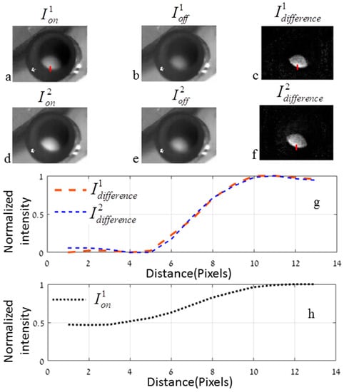 Figure 8. (a,b) and (d,e) Thermal images of the maximum and minimum temperature for two successive cycles; (c,f) Subtractions between the maximum and minimum in each cycle; (g,h) Intensity profile of the cross-sections marked with red lines in (c,f) and (a), respectively.