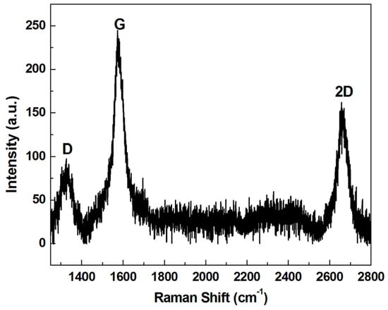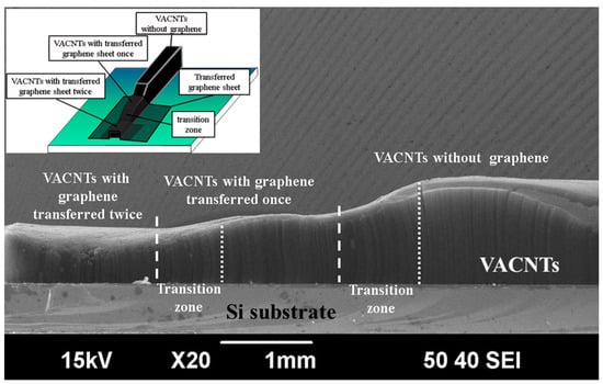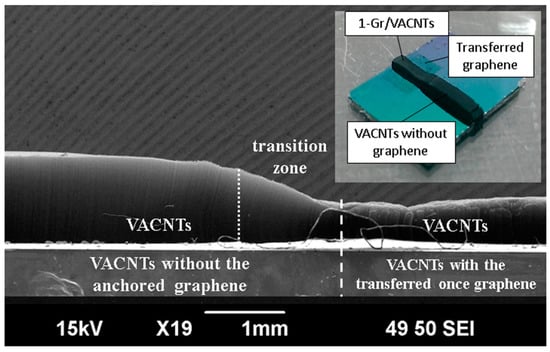 Figure 2 shows the Raman spectrum of the as-grown graphene. The two main peaks corresponded to the G band (~1580 cm−1) and 2D band (~2700 cm−1) of the graphene [18]. The peak intensity of the 2D band peak was lower than that of the G band, with a peak intensity ratio of I2D/IG ~0.67, and the full width at half-maximum of the 2D band peak was 63.1 cm−1. The results indicated few or more layers of graphene [19,20]. A scanning electron microscope (SEM) image is presented in Figure 3. The sample was 1 graphene sheet transferred onto the target substrate. The height of the 1-Gr/VACNTs was 509 um, lower than that of VACNTs of 1070 um without the anchored graphene. Interestingly, the morphology of VACNT was affected at the boundary zone (i.e., transition zone) due to the Van der Waals force of CNTs [21], which resulted in smooth increasing the height of VACNTs at the interface.