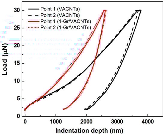 From the VACNTs growth process, Figure 4 shows the type of VACNTs is the multi-wall CNTs [22]. The mechanical properties of the VACNTs and 1-Gr/VACNTs (i.e., VACNTs with the graphene transferred once) were measured with a nanoindentation system (TI 950 TriboIndenter, Hysitron, Minneapolis, MN, USA). A standard Berkovich indenter was used to indent the top surfaces of the VACNTs and 1-Gr/VACNTs with a 30 µN load on the sample surface for 5 s. The slope of the unloading curve was used to determine the reduced modulus (Er) and hardness (H) of the samples according to the theory proposed by Oliver and Pharr [23]. The indentation depth of 1-Gr/VACNTs was less than that of the VACNTs sample, as shown in Figure 5, indicating that the hardness of the Gr-VACNTs was greater than that of the VACNTs. To verify the repeatable results of the nanoindentation measurement, two points were measured. The measurement results of Er and H are listed in Table 1, where it can be seen that the Er and H of 1-Gr/VACNTs were higher than those of the VACNTs. The Er and H of the 1-Gr/VACNTs were 3.633 MPa and 277 KPa, 2 times and 1.9 times those of the VACNTs, respectively. These differences indicated that the anchored graphene strengthened the mechanical properties of the VACNTs. The anchored graphene was similar to an elastic sheet constraining the growth of VACNTs, resulting in compression and a greater density of VACNTs, which enhanced the mechanical properties of the VACNTs. In addition, Wardle et al reported the densification of CNTs enhanced the mechanical properties with the increasing volume fraction of the different diameter CNTs [24].A similar effect may have occurred in this work, resulting in the greater Er and H of 1-Gr/VACNTs. The effect of pre-compression of the VACNTs suggests the graphene constraint enhanced to increase the Van der Waals force of CNTs.