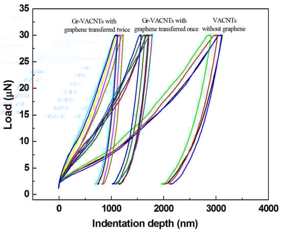 The load-depth curves of 1-Gr/VACNTs, 2-Gr/VACNTs and VACNTs.