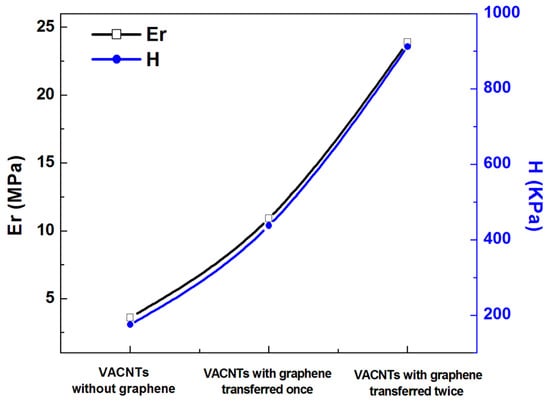 Reduced modulus (Er) and hardness (H) of VACNTs (vertically aligned carbon nanotube) and 1-Gr/VACNTs.