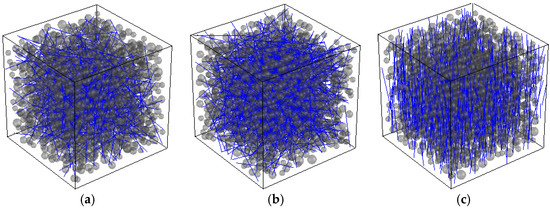 FRC numerical mesostrucures: (a) Vf = 0.5% and θ = 90°; (b) Vf = 1.0% and θ = 90°; and (c) Vf = 1.0% and θ = 10°.