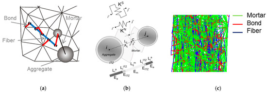 Mesomechanical features of the lattice–particle model: (a) concrete matrix Delaunay’s triangulation and fiber–matrix interaction; (b) aggregates interaction at the contact point and spring elements; and (c) resulting matrix, bond, and fiber mesh.