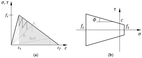 Mesoscale fracture behavior of matrix elements: (a) linear softening curve with sequential reduction; and (b) Mohr–Coulomb fracture surface with tension cut-off and compression cap.