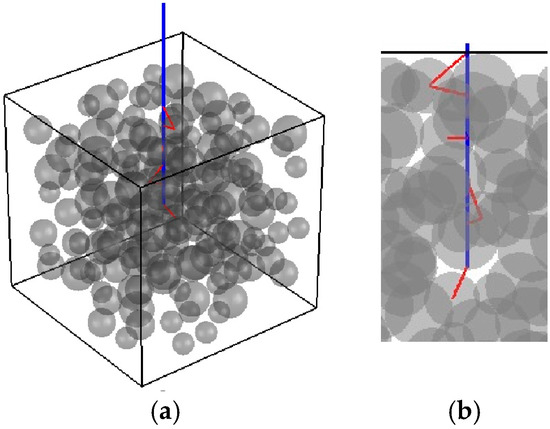 In the first place, a coarse aggregate (i.e., maximum aggregate size, dmax > 4.75 mm) distribution is generated following the procedure described in [20], which considers the mix properties (e.g., water to cement (w/c) ratio or aggregates content). A Fuller’s parabola with exponent n = 0.5 is used for the sieve curve [32] and, as proposed in [33], a 40% volume content of aggregates is assumed. The generated particles are placed within the domain using the take-and-place method [19,20] and, for the sake of simplicity, spherical shapes are considered. During this process, particle overlaps are not allowed.