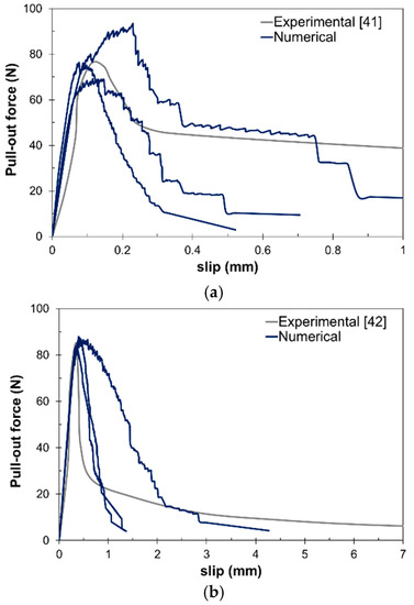 The characterization of the fiber–matrix interface is of great importance in the presented model. For this reason, pullout tests were carried out and compared to existing experimental results [41,42], and the ability of the model to account for different bonding behaviors has been shown. In this sense, a range for the bonding material properties has been presented.