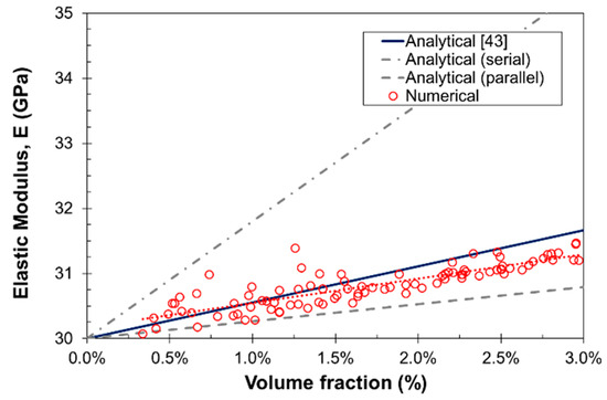 In Figure 6, the numerical results are compared to the analytical expression from [43] and the rule of mixture bounds for composite materials. It can be observed that the numerical results are in agreement with those obtained from [43] and the trend is similar to that of the parallel behavior, as expected. On the other hand, it can be also observed that as Vf increases, the scatter decreases as a result of an increase in the number of nodes in the system.