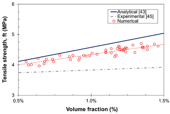 Figure 7 shows the numerical results for the tensile strength for different volume fractions. The results are in agreement with those obtained from the expression in [43]. The effect of Vf in ft is slightly lower in the numerical simulations, but larger than those reported in [45].