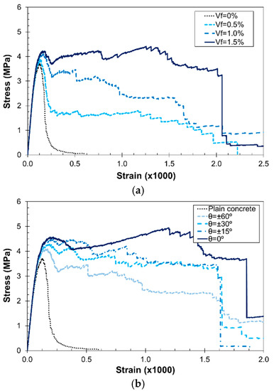 SFRC uniaxial tension stress–strain curves: (a) effect of Vf with θ = 60°; and (b) effect of θ with Vf = 1.0%.