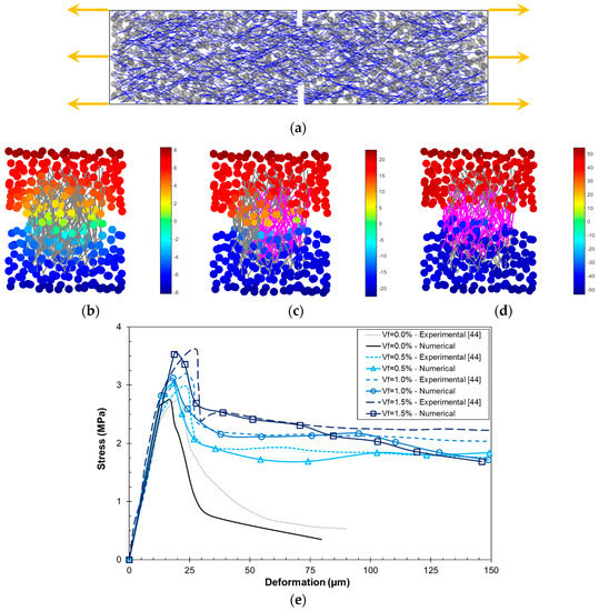 DEN tensile test simulations: (a) numerical mesostructure generation with 5 mm aggregates and steel fibers with Vf = 1.0% and θ = 45°; (b) displacement field (in μm) at the pre-peak regime (15 μm deformation); (c) displacement field (in μm) at the post-peak regime (softening, 50 μm deformation) and acting fibers (in magenta); (d) displacement field (in μm) at the post-peak regime (residual capacity, 100 μm deformation) and acting fibers (in magenta); and (e) uniaxial tension stress–deformation curves for different Vf.