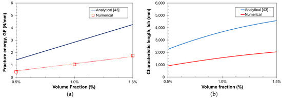 The computed GF and lch are compared to the analytical results proposed in [43] in Figure 10. The numerical predictions for GF are lower than the analytical values (Figure 10a). This can be explained by the type of softening curve used at the mortar level, which can be enhanced so as to catch better the tail of the curves, and the fact that the integration of ductile curves presented by FRC, in which the softening tail is not always fully developed, is way more complex than that for plain concrete. Finally, the numerical characteristic length was derived from regression curves for E, GF and ft, and using Equation (20). Since lch is directly proportional to GF, the differences in the latter are also brought into the former (Figure 10b).