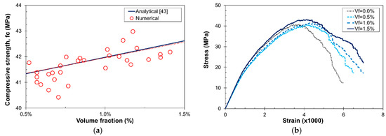 The uniaxial compression characterization is numerically more demanding than in tension, as the strain values are larger. For this reason, the same approach as in Section 3.2.2 was followed but for a total number of 30 simulations in cubic specimens with size 50 mm. The compressive strength dependence with respect to Vf is presented in Figure 11. Figure 11a presents the numerical predictions for the compressive strength, which are in perfect agreement with those from the analytical expression by Karihaloo and Lange-Kornbak [43]. On the other hand, Figure 11b shows the stress–strain curves for different Vf and, as shown in [3], the ductility of the composite material increases with this value.