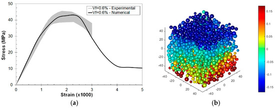 Uniaxial compression test: (a) experimental validation for Vf = 0.6% and θ = 45°; and (b) vertical displacement field (in mm) at a total strain of 3% (post-peak).