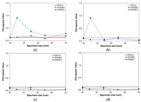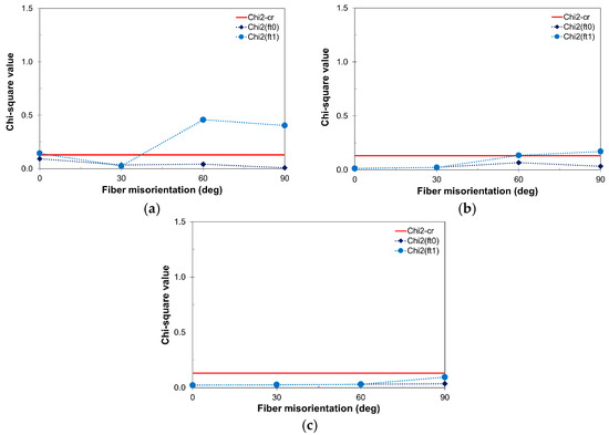 Chi-square tests for ft0 and ft1 on specimens of D = 60 mm and different θ: (a) Vf = 0.5%; (b) Vf = 1.0%; and (c) Vf = 2.0%.