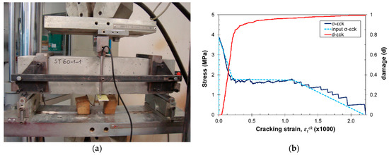 The 3PBT numerical simulations were carried out in Abaqus using the concrete damage plasticity model [48], which has been successfully proven in these kind of analyses [14]. Figure 15a shows the experimental setup for the 3PBT. In 3PBT configurations, tensile behavior governs the global response of the structure, therefore the uniaxial tensile behavior of the material was obtained from lattice–particle simulations on specimens fulfilling the previous RVE size considerations, and the resulting stress–cracking strain and tensile damage–cracking strain curve were extracted (Figure 15b).