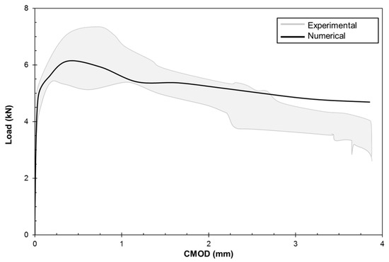 Figure 16 presents the load-CMOD response comparison between the experimental and numerical results. The numerical results are in agreement with the experimental results, especially in the peak and post-peak range, showing the ability of the mesoscale fiber-reinforced lattice–particle model for providing reliable input parameters for macroscale models in a hierarchical homogenization multiscale approach.