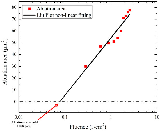 Material removal in laser machining occurs when the laser fluence is higher than the material's ablation threshold, which is strongly dependent on the interaction between light and matter. To test this using a small number of pulses, it is necessary to use a Liu plot [24,25] to determine the threshold at which ablation takes place. The fluence needed to penetrate a sample is higher than this threshold. The minimum fluence at which machining takes place is calculated by extrapolating the relationship between the fluence and the hole diameter on a Liu plot. To do this, the objective lens is accurately focused on the sample surface and each pulse is generated while increasing and decreasing the fluence. The processed sample is then observed with an optical microscope. The diameter of each processed part is calculated and associated with the fluence at that position. The nonlinear relationship between the fluence and hole diameter is shown in Figure 2. The ablation threshold value was calculated from the interaction between the Invar alloy and the femtosecond laser.