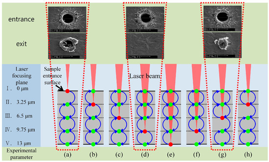 Figure 3 shows a schematic diagram of the experiment for determining the process parameters of the vibrator along with the scanning electron microscopy (SEM) image of the front and back sides of the processed hole. The vibration amplitude was set to 13 μm, which was the same size as the sample thickness, in order to adjust the taper angle according to the amplitude (as described later). Eight pulses accumulated at one hole per vibration cycle at this oscillation frequency and laser repetition rate. Considering that the eight pulses were focused and converted into sinusoidal functions by vibration, five focal planes including the sample front and back sides were defined by dividing the material into four parts along its thickness (Figure 3, I–V). Furthermore, the parameters of the experiment were determined by considering the number of focal points (Figure 3, I–V) at which the first pulse was focused when the focus was changed by the vibration and the number of subsequent focal plane positions (Figure 3a–h). The red dot in each experimental parameter indicates the position at which the first pulse was focused, and from which position it moved after the vibration started. The focal plane moved in the direction of the blue arrow according to the experimental parameters, and the second to eighth pulses were focused on the green points in each of the specified focal planes. The entrance diameters of the processed holes seem to be similar for each experimental parameter. However, the exit diameters were significantly affected by the experimental parameters, and some samples did not have an exit diameter because they were not penetrated. The results show that experiment (a) was the optimum processing condition with the deepest processed depth.