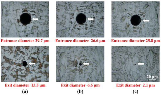 To overcome the disadvantages of chemical etching, femtosecond laser processing is attracting increased attention. Femtosecond lasers have an advantage over nanosecond lasers in ultra-precision processing in terms of the small heat-affected zone (HAZ) owing to their short pulse duration [15,16]. Productivity and process quality control for femtosecond laser FMM machining concerns a deep pulse processing depth for the same process variables and adjustment of the taper angle of the machined hole.
