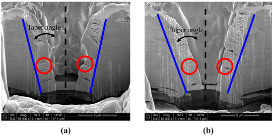 Examples of cross-sectional images of the hole drilled by vibration-assisted femtosecond laser drilling: Taper angles (a): 10.03°; (b): 14.22°; Experimental parameters: 1027 nm wavelength, 190 fs pulse duration, 1 kHz repetition rate, 1.1 μJ pulse energy, 100 pulses. Settings for M Plan Apo NIR (Mitutoyo): 0.42 NA, 50× lens magnification, 200 Hz of vibration frequency, vibration amplitudes (a): 1.4 μm; (b): 3.1 μm.