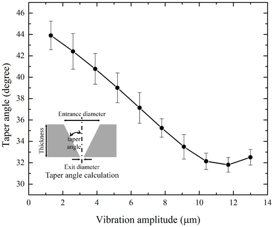 Plot of hole taper angle via vibration amplitude control using a vibration-assisted femtosecond laser hole drilling system. Inset: the definition of the taper angle.
