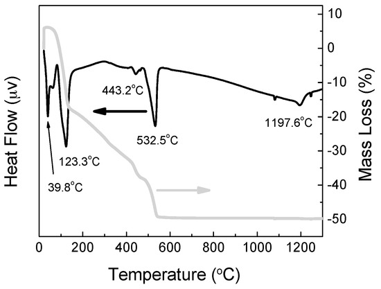 The thermal behaviour of the as-prepared powder was carried out using (SETARAM DTA-TG Setsys Evolution-1750, SETARAM Inc., Hillsborough, NJ, USA), with α-Al2O3 powder as a reference material. A powder sample with a weight of about 50 mg was analysed. The sample and the reference material were heated from ambient temperature to 1300 °C in an argon atmosphere at a heating rate of 20 °C/min.