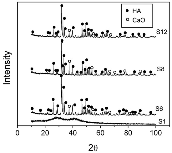 The XRD pattern of the as-prepared sample S1 is mainly amorphous, and there is no obvious diffraction peak observed (Figure 3). In the case of the thermally treated samples, S6, S8 and S12, the increase of the temperature of the thermal treatment produces significant changes in the crystalline structure of the samples. These changes are reflected in the appearance of several peaks, which are ascribed to the diffraction peaks of the HAp phase. The XRD pattern of the thermally treated S6, S8 and S12 indicates the existence of calcium oxide as traces, together with HAp as main phase.