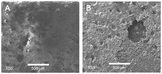 SEM images of the surface resulting from the adhesion test for samples with and without coating: (A) HAp coated sample and (B) uncoated sample.