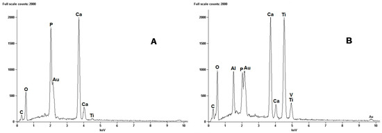 EDX for samples observed by SEM: (A) HAp coated sample and (B) uncoated sample.