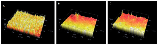 The roughness of the Ti6Al4V substrate and HAp coatings was evaluated with an Optical Imaging Profiler Sensofar PLμ 2300 (Sensofar-Tech SL, Terrassa, Barcelona, Spain) assisted by standard Dektak 6M software (version 8.35, Veeco Instruments Inc., Tucson, AZ, USA), operating in confocal mode. Measurements were realized by using a confocal objective EPI 20X at a working distance of 4.5 mm with a numerical aperture of 0.45, which results in a spatial sampling of 0.81 μm and a rms resolution of <20 nm. Three different areas were selected on each sample to perform the measurements. On each area, eight roughness determinations were made to obtain the Ra parameter, among others. Concretely, Ra was obtained from a line scanning of 80 μm. The Ra values here included were the medium value obtained as result of the 24 measurements performed on each sample.