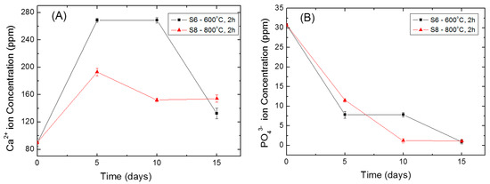 In the spectrum of the 600 °C/2 h thermally treated sample S6 the two weak peaks at 1465, 1419 cm−1 (ν3) and a small shoulder observed at 875 cm−1 indicate that the CO32− groups were substituted for PO4−3 groups, forming B-type carbonated apatite [31] (spectrum B in Figure 2). These carbonate bands appeared in the 800 °C/2 h thermally treated sample S8 at 1466 and 870 cm−1 (spectrum C in Figure 2).