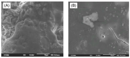 Studies of the surface morphology of selected specimens, before and after immersion in SBF, were carried out by SEM with a Field Emission Gun Scanning Electron Microscope JEOL 6500F (Akishima, Tokyo, Japan) coupled with an energy dispersive X-ray (EDX) system (Oxford Inca microanalysis system and a windowless detector) for chemical analysis. The samples were examined at a 15 kV or 20 kV accelerating voltage, according to the surface nature. The samples were previously coated with ultra-thin carbon conductive layer to avoid the charging due to the nonconductive nature of the studied samples.