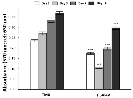 Absorbance measurements obtained after using Alamar Blue™ assay for cultured human osteoblasts seeded on the TMX control and the HAp sol-gel-derived coating/Ti6Al4V system studied (*** p < 0.001).