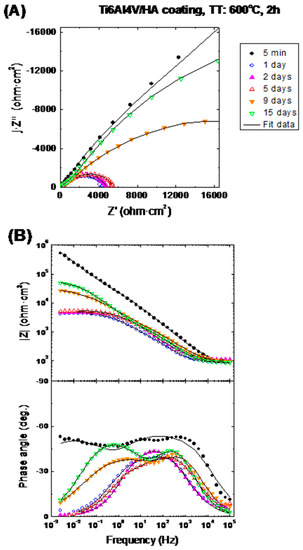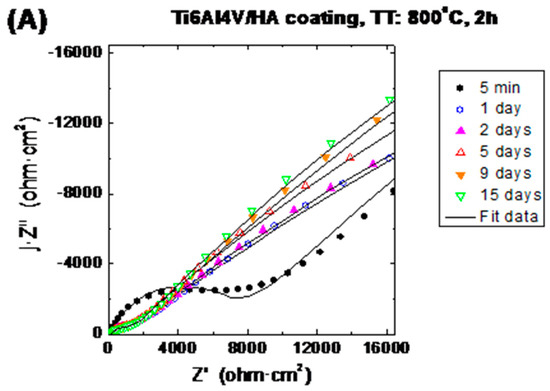 Electrochemical impedance spectroscopy (EIS) was used for evaluating the barrier properties of the HAp coatings and the corrosion behaviour of the HAp-coatings/Ti6Al4V systems. Figure 14 and Figure 15 show the evolution of the impedance plots with the immersion time in SBF for the HAp-coatings/Ti6Al4V systems thermally treated at 600 °C/2 h and 800 °C/2 h, respectively. Figure 14A and Figure 15A show the impedance data represented as Nyquist plots, where the imaginary part (Z′′) of the impedance vector Z(f) is represented in the complex plane against the real part (Z′) of this vector, with the frequency (f) as implicit variable [38,39]. Figure 14B and Figure 15B show the same impedance data in Bode representation. In the Bode diagrams the logarithm of the magnitude of the impedance vector (log |Z|) and the phase angle (θ) are plotted against the logarithm of frequency (log f) of the applied sinusoidal electric voltage signals [39].