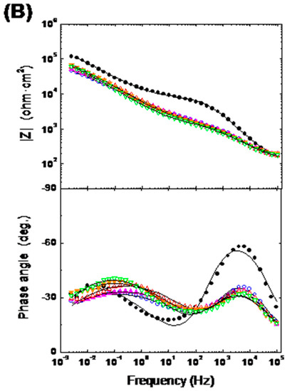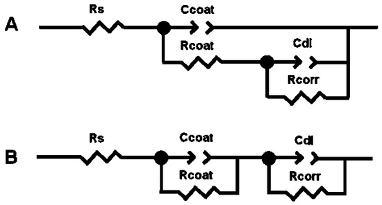 The EEC showed in Figure 16A has been successfully used in a lot of studies related with the corrosion protection behaviour of organic coatings on metal surfaces [42,43,44,45]. The EEC showed in Figure 16B has been also used several times with providing also successful results [16,42]. Following the notation of the ZView commercial software, in both electrical equivalent circuits Rs represents the solution resistance of the bulk electrolyte. Ccoat is the coating capacitance. Because of inhomogeneities in the coating, Ccoat has to be implemented as a Constant Phase Element (CPEcoat). Rcoat is the coating pore resistance. Rcorr represents to the corrosion resistance of the metal substrate and Cdl is the double layer capacitance at the metal/electrolyte interface, both at the base of pores and perforations of the coating. Due to inhomogeneities in the coating and metal surface, this capacitance has also to be implemented as a CPEdl.
